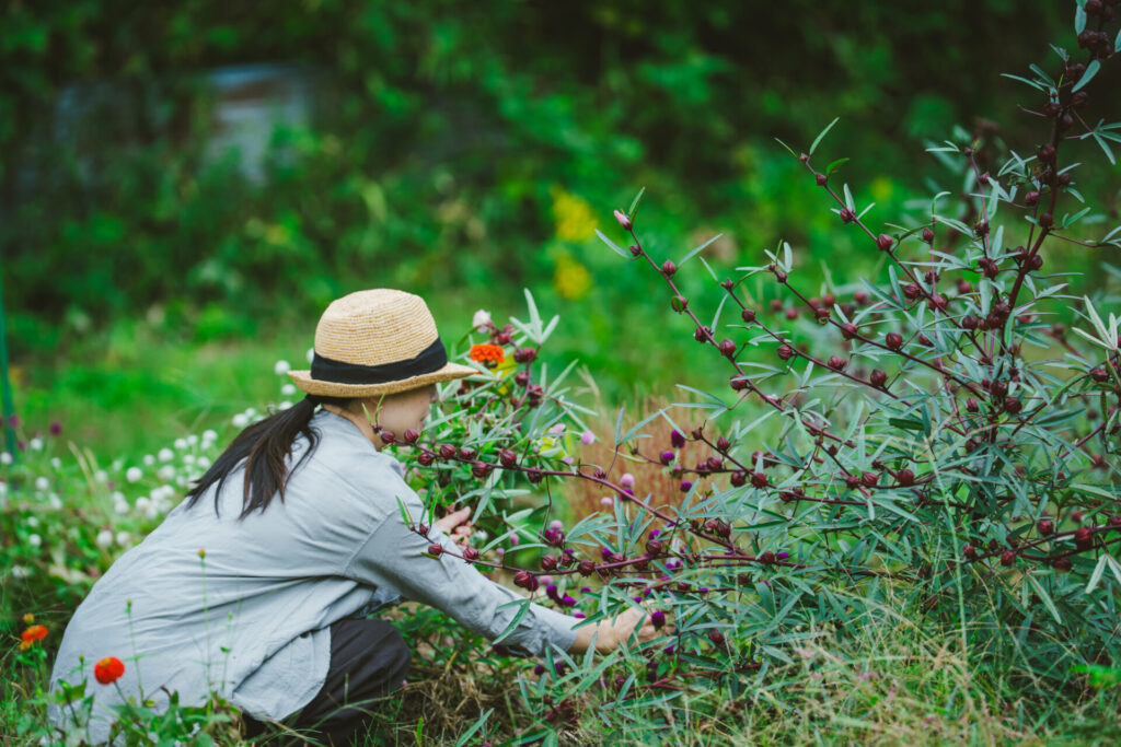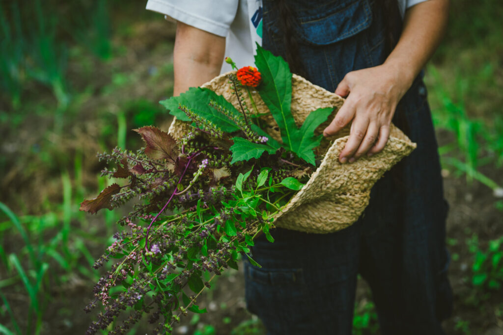 香川さんの挨拶と説明を受け、布を染めるための花やハーブ、野菜を摘んでいきます。