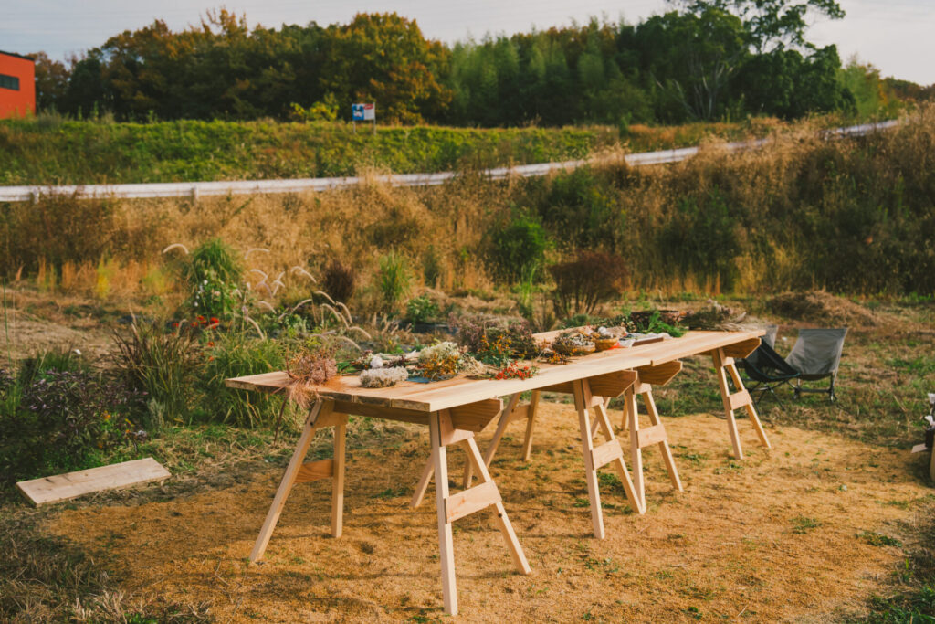 畑の奥には、大きな木の机が。既に岡野さんが用意した草花が並んでいます。