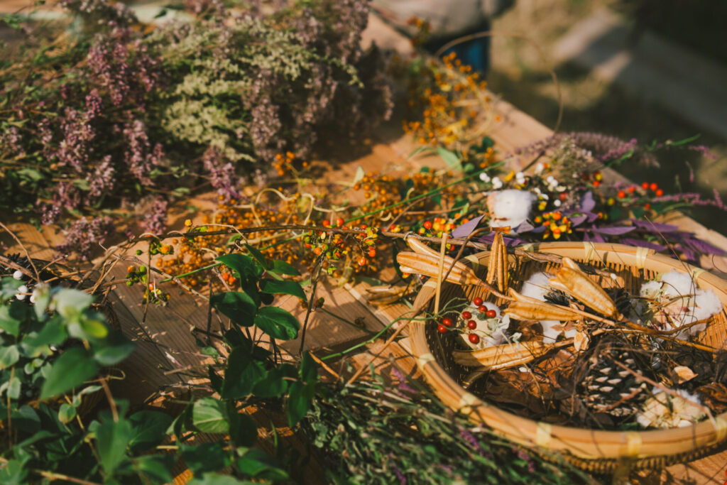 南天、ツルウメモドキ、アナベル、ナンキンハゼ、ヘクソカズラなど、岡野さんが日々集めながらドライにした草花の中から好きなものを選んで飾り付けます。