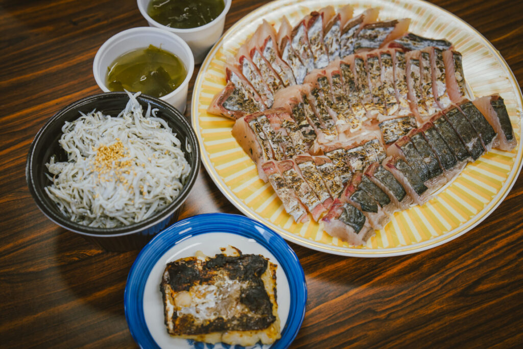 しっかりとお話を聞いて学んだあとは、念願の試食タイムです。漁師さんが捌いてくれたサワラのお刺身や味噌漬けを食べてみます。なぜか、しらす丼とわかめの味噌汁もあるのですが…もう試食ではなく食事です。「来てくれてうれしい!」という漁師さんたちのサービスでした。参加者のみなさんの「うまーーっっ!」の声が広がります。