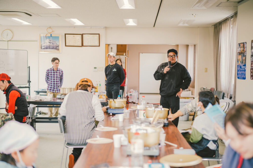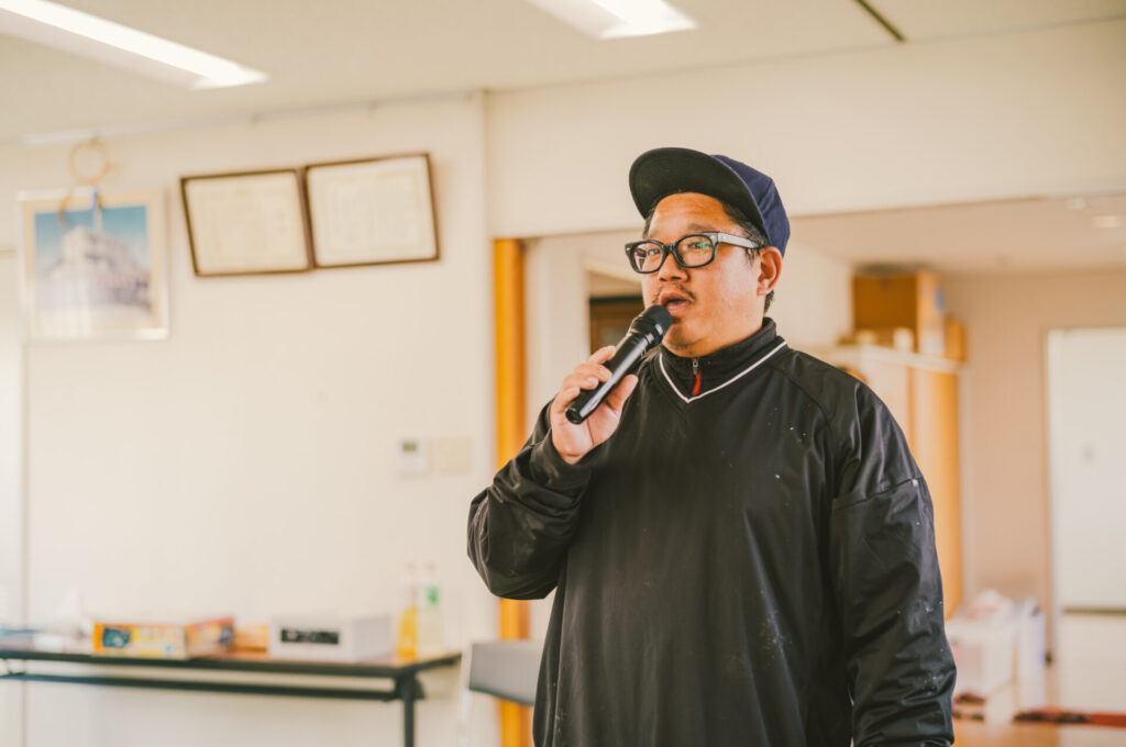 漁師の西村さんからイベント開始の挨拶です。今回は、当日、漁師のみなさんが獲った生のしらすを使うことができました。前日や当日の朝に、しらすが必ず獲れるとは限りません。新鮮な魚を使ってイベントを…というのも実は難しいのが自然相手の仕事です。