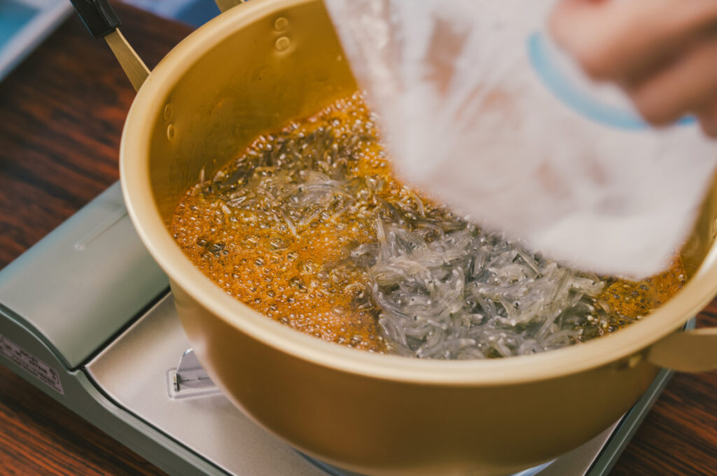 漁師さんからつくり方を聞き、早速調味料や生姜を鍋の中へ入れ煮立たせ、生のしらすを入れていきます。