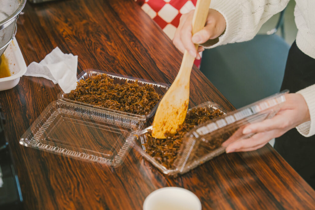 汁気が無くなれば、釘煮の完成です。ザルにあけ、粗熱をとったらそれぞれの持ち帰りパックに詰めて終了です。「長年いかなごの釘煮をつくっていて、今回のイベントを目にしたときにすぐ応募しました。懐かしくて楽しかったです。」そんなお声もいただくイベントとなりました。