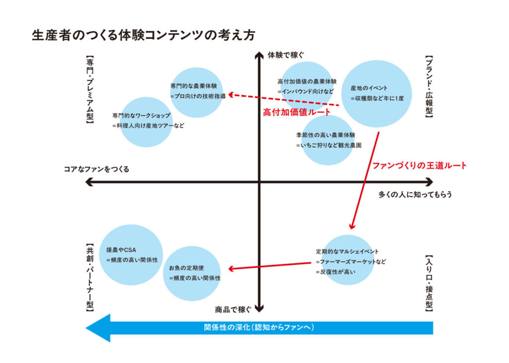 岩本:そうですね。一方の極にあるのは、フィッシャーマンズマーケットのような不特定多数の人がたくさん集まって漁師さんとも軽く接しながら美味しいものを食べるような形。反対側の極は、定期的に畑にやってきて農家と日常的な関係性があり、野菜もずっと買ってくれるような形でしょうか。ではイチゴ狩りのような観光農園はどこにあたるのか?など。これを体系化していけば、もう少し見えてくるものやゴールのイメージが分かりやすくなるのかもしれません。ゴールを考えることで、コンテンツを実施した際に成功したのか、改善点があるのか、見極めることができるようになります。例えば、多くの人に参加していただくことで目的を達成したか、それとも参加者は少なくても一定の収入があればいいのか、これらをクリアにすることが継続するモチベーションを維持することにつながるのかなと。