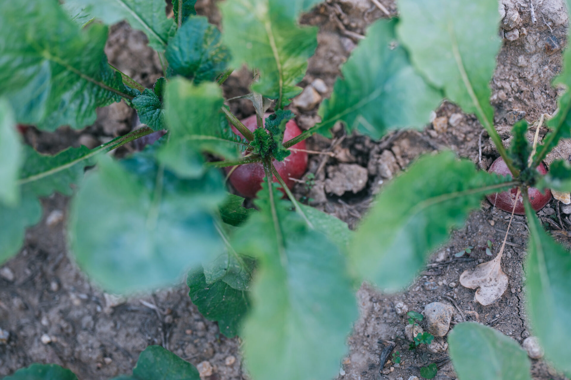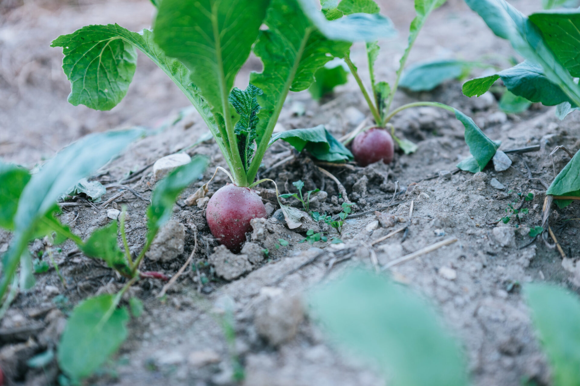 ラディッシュ、黒豆を中心に、水菜、ほうれん草、白菜、ビーツなど、少量多品目で無農薬栽培。特に注力しているのはラディッシュ栽培で、ラディッシュの収穫タイミングや生育サイクルを考慮しながら、その他の品目を選定している。